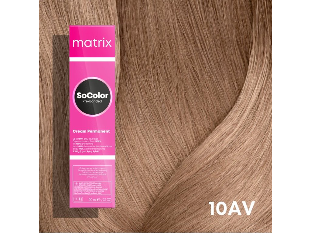 Matrix SoColor 10AV je permanentná farba s odtieňom svetlý popolavý fialový blond, navrhnutá pre dosiahnutie čistého, chladného blond výsledku bez nežiaducich žltých tónov. Vďaka pokročilej technológii poskytuje intenzívnu farbu, ochranu vlasového vlákna a jednotný výsledok od korienkov po končeky.