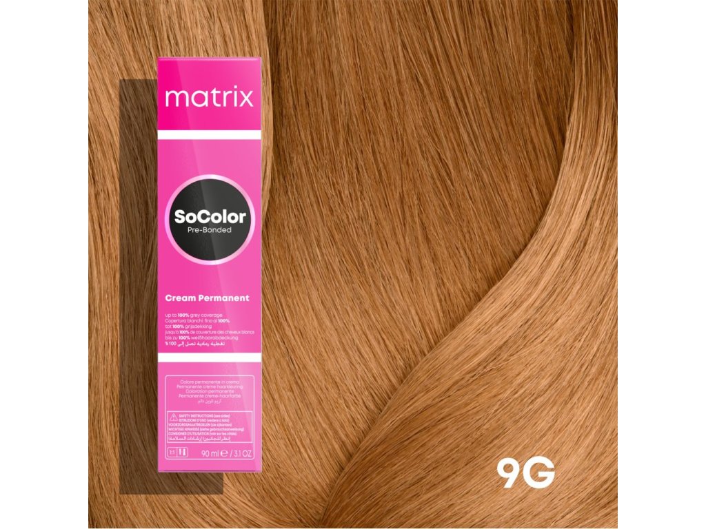 Matrix SoColor 9G je permanentná farba s odtieňom veľmi svetlý blond – zlatý, ideálna pre klientov, ktorí túžia po teplom, žiarivom blond tóne s prirodzeným leskom. Dodáva vlasom sviežosť, jas a slnečný nádych bez oranžového efektu.